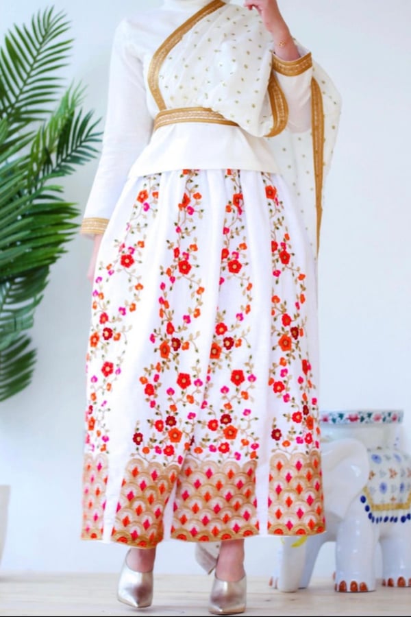 A suit blouse , scarf and skirt