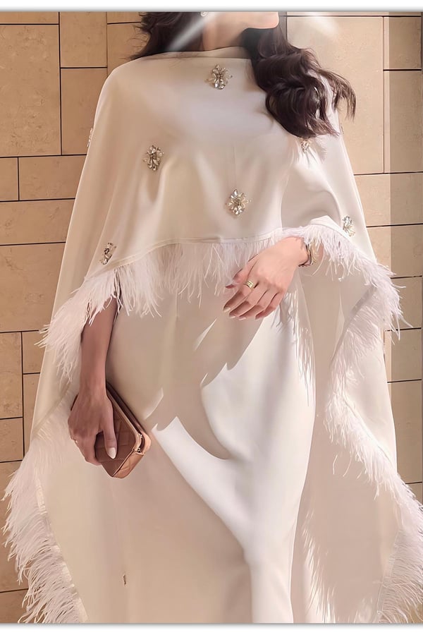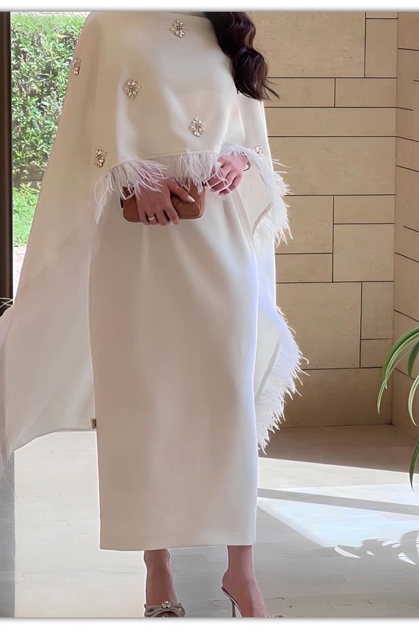 skinny dress with a fixed shawl with crystals and feathers