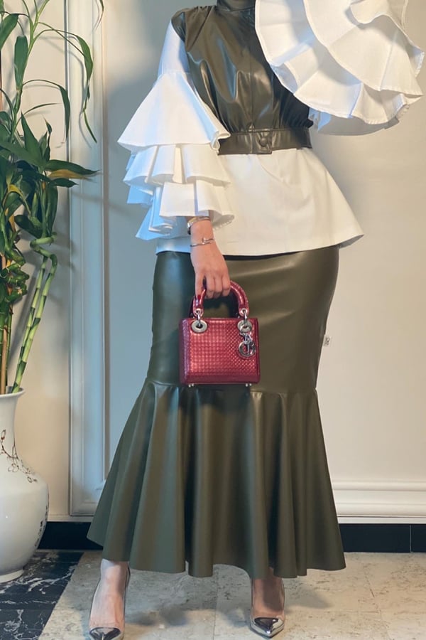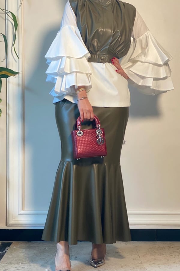A suit leather skirt ,vest and blouse