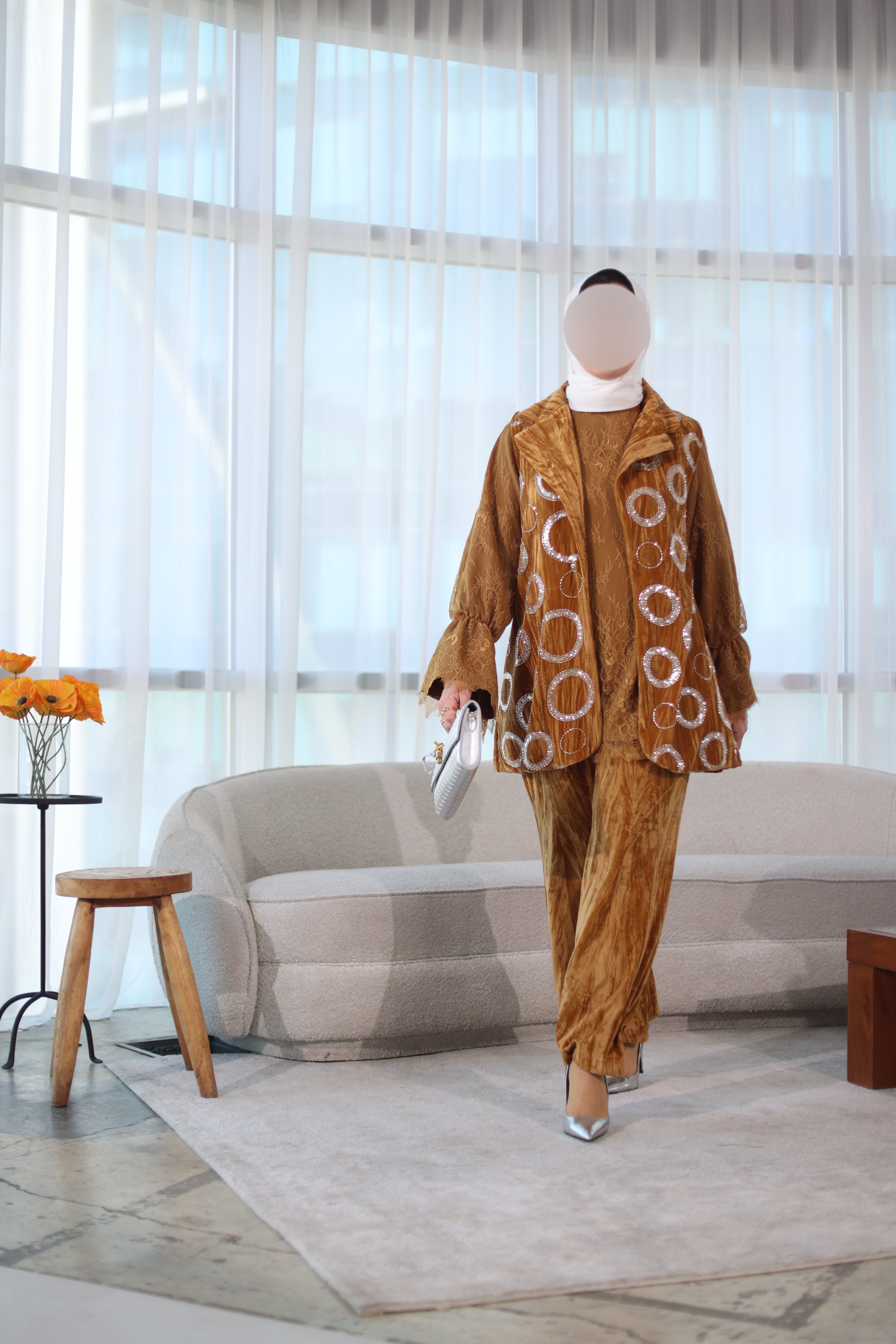 قميص دانتيل مع فيست وبنطلون مخمل